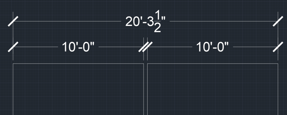 Massive problem to avoid when dimensioning in imperial is allowing the cad program to round things up or down. Below is geometrically correct, but absolutely incorrect because of rounding being allowed. The space in the middle now has an incorrect dimension, and the overall building now has an incorrect dimension.