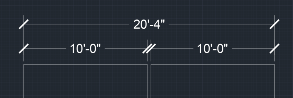 Conclusion: Set your cad program to 1/256″ of accuracy, and all of your automatic dimension strings to that same accuracy, so when the building is built, you and your docs aren’t 1/2 of an inch off (or way more). If we automate the placement of building level dimstrings, we need to confirm that any floating point rounding that happens doesn’t destroy the clarity of a good dimstring.