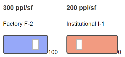 The pie chart shows the % occupancy contribution. Lower sf/person requires a higher overall floor load, especially if there is a lot of it. Since this isn't that intuitive, I will build a scenario explorer.