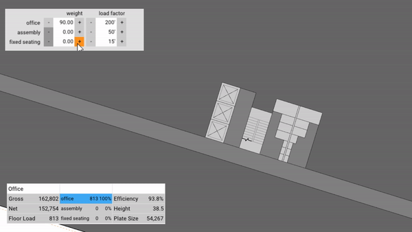 Here we have the user adding more assembly and fixed seating space to a floor plate (conceptually). Here we see the math pushing the bathrooms to grow in size, as well as the exit capacity of the stair to grow in width. This is a bespoke, IBC inspired core generator that takes floor loads and generates the compliant minimum bathroom. It is not a generic room configurator, but it does give hints about how one might build a generic configurator.