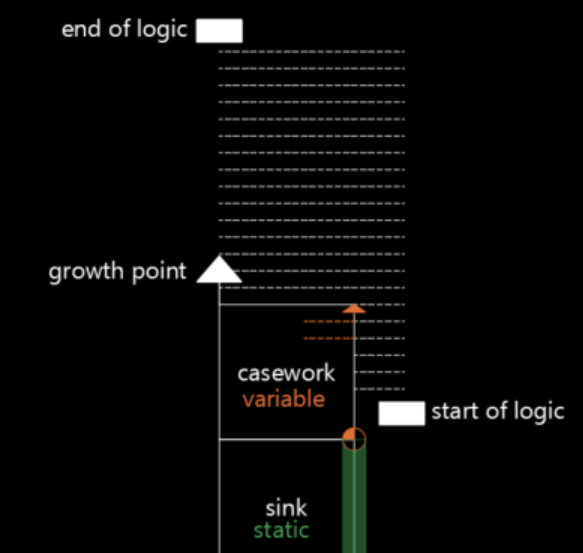 Years ago I would have actually drawn every frame of this kitchen array and animated it to see if what was in my head makes sense. I know this makes sense. Look at the code-driven bathroom. What if the kitchen array is driven by population of the household. Something like 12″ of additional casework per additional bedroom would be a good scaling heuristic.