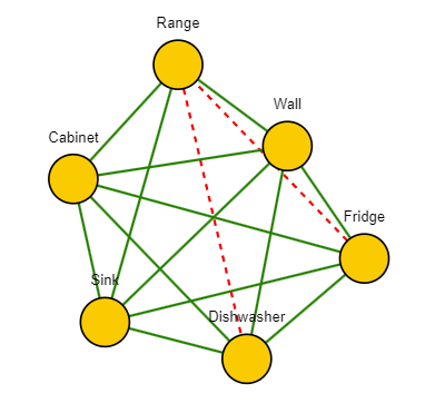 | Fridge | Sink | Range | Dishwasher | Cabinet | Wall | |