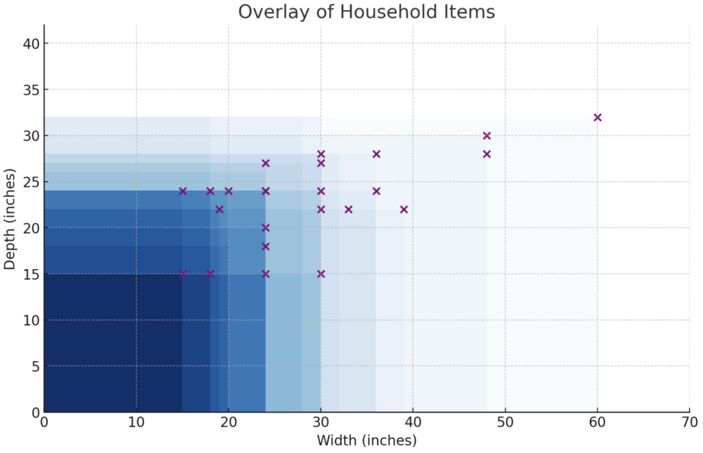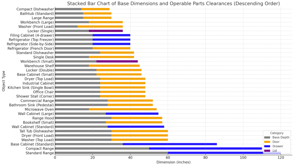 Unfortunately those 2×2 squares need some other kind of consideration, especially when they have operable clearances. Some of this chart makes no sense (had chat gpt make this) but in concept, shows that an object has a clearance requirement, and that can change based on available area.