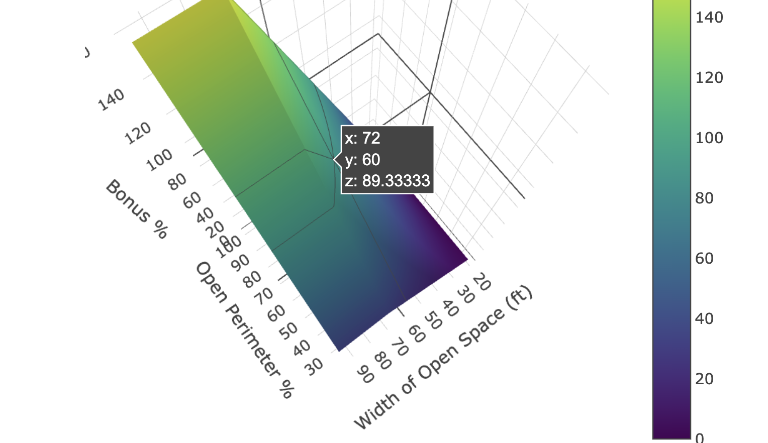 The frontage bonus rewards buildings that sit away from other buildings and expose more of their perimeter. It can add up to 166% to your allowable area — potentially cutting the required number of buildings in half. The surface shows the full bonus landscape. The sliders show your specific position on it.