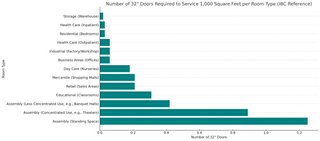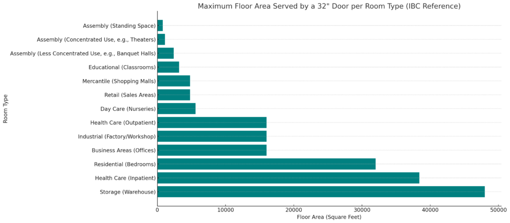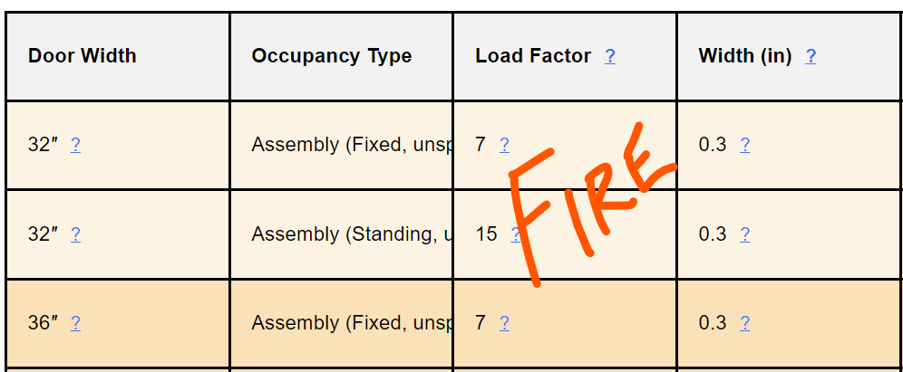 Given the code, the minimum door needs to be 32″ wide, which can serve up to an ungodly large bedroom for exiting, but not even enough for 1000 SF of assembly space. Check out the math: