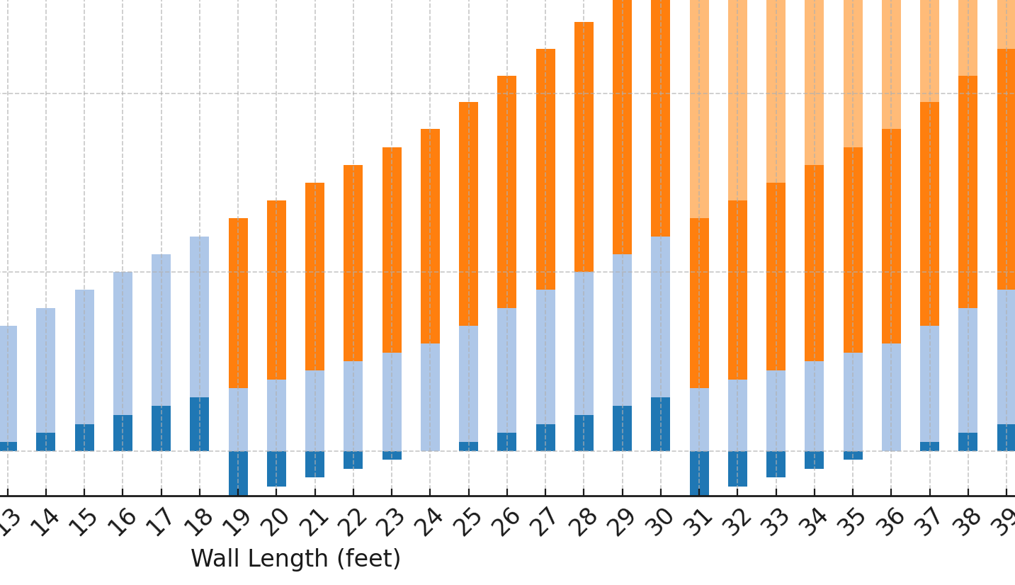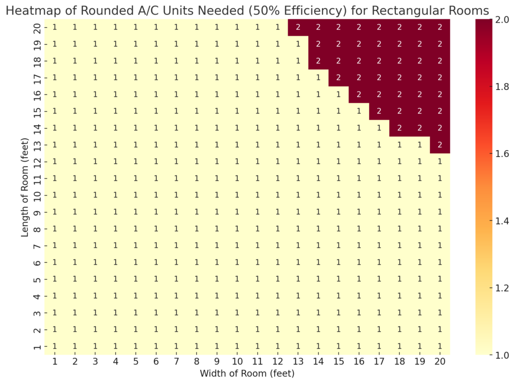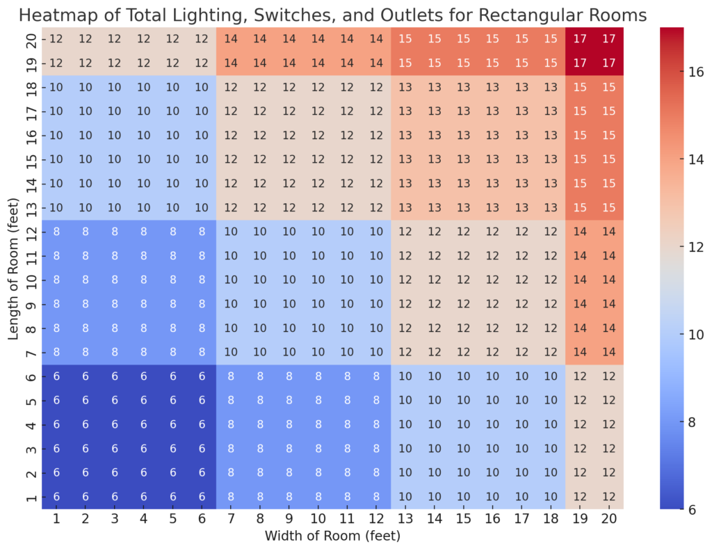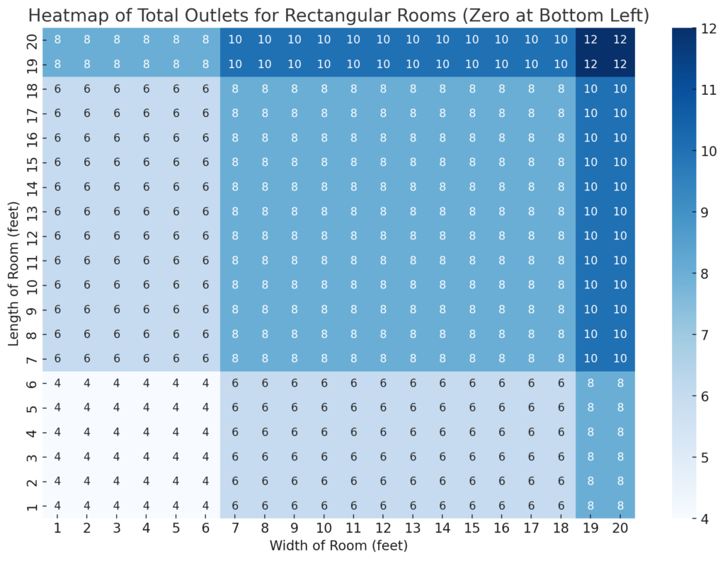 Overlay the two on top of one another (and add half-hot/ lighting requirements) to get the table of total needed electrical things in a room for given dimensions x and y. I think this is accurate, given what chatgpt was able to comprehend from my incomprehensible input (there might be mistakes in this map):