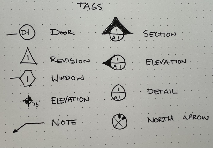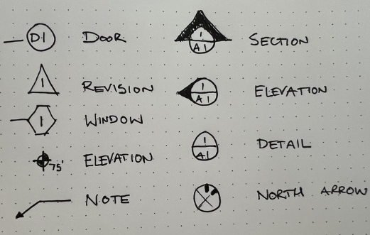 There are slews of symbols on the construction document sets that to the untrained eye are terrifying. I’ll break it down into a few sub-categories.