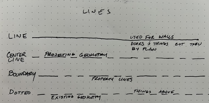 - Dotted – All dots – Often used to show things above (in plan) or things that will be demolished, or things that currently exist.